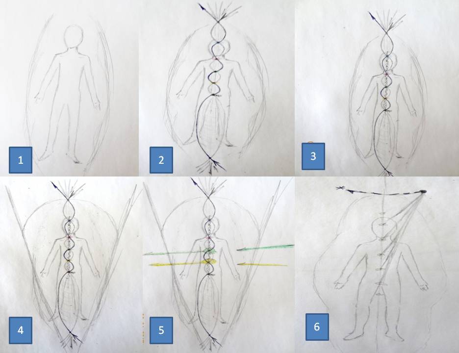 Центры (Чакры) соединены между собой по центру тела и с узлом  вне тела… думаю это то, что называют «Точка сборки».  При ее вращении каким-то образом меняются фазы (не могу подобрать другое слово), это меняет течение энергии в общем потоке.. Как бы скручивает всю структуру.  Я пока не поняла как это может быть чисто конструкционно.  (рис . 6)